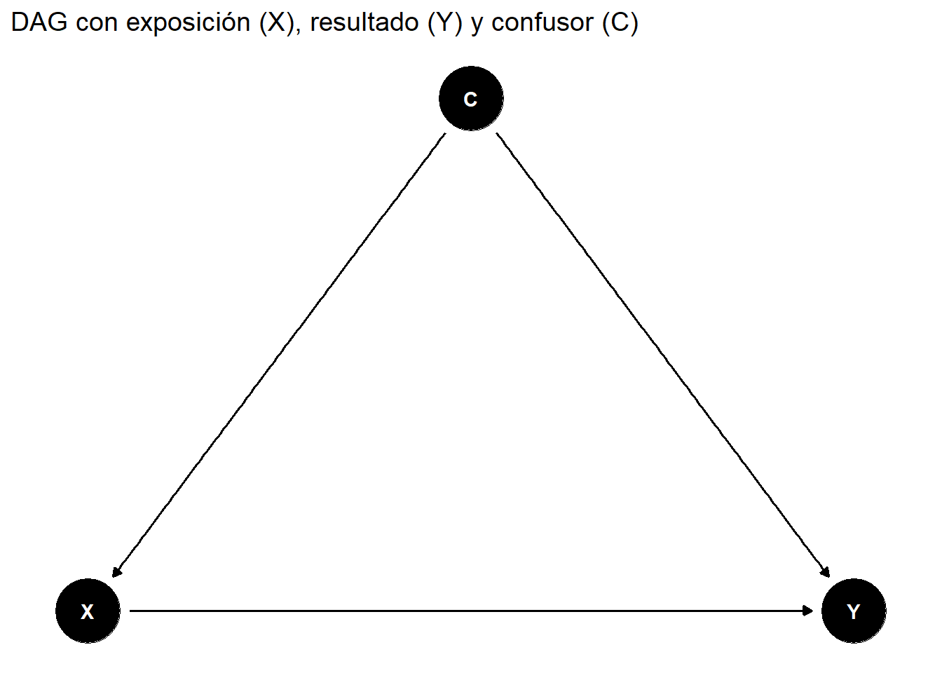 labs(title = "DAG con exposición (X), resultado (Y) y confusor (C)")